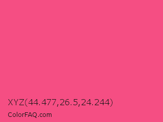 XYZ 44.477,26.5,24.244 Color is a light rose color and the nearest color is French Rose #f64a8a. Hex code #f54e83 and RGB value is rgb(245,78,131). In RGB color space, this color is composed of 96% red, 31% green, 51% blue, In CMYK color space, this color is composed of 0% cyan, 68% magenta, 47% yellow , 4% black , In HSL color space, this color has a hue angle of 341° , 89% saturation and 63% lightness.