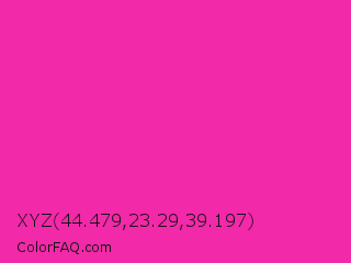 XYZ 44.479,23.29,39.197 Color is a normal magenta color and the nearest color is Persian Rose #fe28a2. Hex code #f229a8 and RGB value is rgb(242,41,168). In RGB color space, this color is composed of 95% red, 16% green, 66% blue, In CMYK color space, this color is composed of 0% cyan, 83% magenta, 31% yellow , 5% black , In HSL color space, this color has a hue angle of 322° , 89% saturation and 55% lightness.