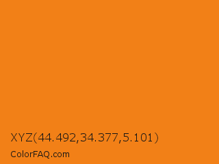 XYZ 44.492,34.377,5.101 Color is a normal orange color and the nearest color is Tango #ed7a1c. Hex code #f28017 and RGB value is rgb(242,128,23). In RGB color space, this color is composed of 95% red, 50% green, 9% blue, In CMYK color space, this color is composed of 0% cyan, 47% magenta, 90% yellow , 5% black , In HSL color space, this color has a hue angle of 29° , 89% saturation and 52% lightness.