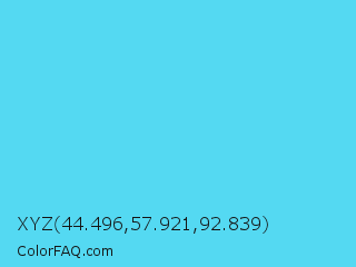 XYZ 44.496,57.921,92.839 Color is a light cyan color and the nearest color is Turquoise Blue #6cdae7. Hex code #54d9f2 and RGB value is rgb(84,217,242). In RGB color space, this color is composed of 33% red, 85% green, 95% blue, In CMYK color space, this color is composed of 65% cyan, 10% magenta, 0% yellow , 5% black , In HSL color space, this color has a hue angle of 189° , 86% saturation and 64% lightness.