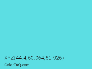 XYZ 44.4,60.064,81.926 Color is a light cyan color and the nearest color is Turquoise Blue #6cdae7. Hex code #5cdee3 and RGB value is rgb(92,222,227). In RGB color space, this color is composed of 36% red, 87% green, 89% blue, In CMYK color space, this color is composed of 59% cyan, 2% magenta, 0% yellow , 11% black , In HSL color space, this color has a hue angle of 182° , 71% saturation and 63% lightness.