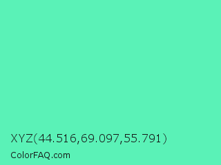 XYZ 44.516,69.097,55.791 Color is a light green color and the nearest color is Medium Aquamarine #66ddaa. Hex code #5af2b7 and RGB value is rgb(90,242,183). In RGB color space, this color is composed of 35% red, 95% green, 72% blue, In CMYK color space, this color is composed of 63% cyan, 0% magenta, 24% yellow , 5% black , In HSL color space, this color has a hue angle of 157° , 85% saturation and 65% lightness.