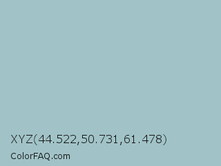 XYZ 44.522,50.731,61.478 Color is a light cyan color and the nearest color is Opal #a9c6c2. Hex code #a1c3c7 and RGB value is rgb(161,195,199). In RGB color space, this color is composed of 63% red, 76% green, 78% blue, In CMYK color space, this color is composed of 19% cyan, 2% magenta, 0% yellow , 22% black , In HSL color space, this color has a hue angle of 186° , 25% saturation and 71% lightness.
