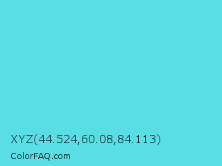 XYZ 44.524,60.08,84.113 Color is a light cyan color and the nearest color is Turquoise Blue #6cdae7. Hex code #59dee6 and RGB value is rgb(89,222,230). In RGB color space, this color is composed of 35% red, 87% green, 90% blue, In CMYK color space, this color is composed of 61% cyan, 3% magenta, 0% yellow , 10% black , In HSL color space, this color has a hue angle of 183° , 74% saturation and 63% lightness.