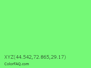 XYZ 44.542,72.865,29.17 Color is a light green color and the nearest color is Screamin Green #66ff66. Hex code #75f977 and RGB value is rgb(117,249,119). In RGB color space, this color is composed of 46% red, 98% green, 47% blue, In CMYK color space, this color is composed of 53% cyan, 0% magenta, 52% yellow , 2% black , In HSL color space, this color has a hue angle of 121° , 92% saturation and 72% lightness.