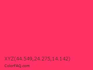 XYZ 44.549,24.275,14.142 Color is a normal red color and the nearest color is Radical Red #ff355e. Hex code #ff3063 and RGB value is rgb(255,48,99). In RGB color space, this color is composed of 100% red, 19% green, 39% blue, In CMYK color space, this color is composed of 0% cyan, 81% magenta, 61% yellow , 0% black , In HSL color space, this color has a hue angle of 345° , 100% saturation and 59% lightness.