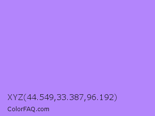 XYZ 44.549,33.387,96.192 Color is a light violet color and the nearest color is Bright Lavender #bf94e4. Hex code #b385fc and RGB value is rgb(179,133,252). In RGB color space, this color is composed of 70% red, 52% green, 99% blue, In CMYK color space, this color is composed of 29% cyan, 47% magenta, 0% yellow , 1% black , In HSL color space, this color has a hue angle of 263° , 95% saturation and 75% lightness.