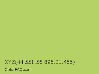 XYZ 44.551,56.896,21.466 Color is a light lime color and the nearest color is Wild Willow #b9c46a. Hex code #b5d267 and RGB value is rgb(181,210,103). In RGB color space, this color is composed of 71% red, 82% green, 40% blue, In CMYK color space, this color is composed of 14% cyan, 0% magenta, 51% yellow , 18% black , In HSL color space, this color has a hue angle of 76° , 54% saturation and 61% lightness.