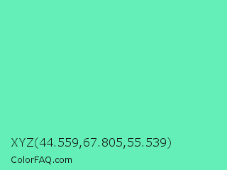 XYZ 44.559,67.805,55.539 Color is a light green color and the nearest color is Medium Aquamarine #66ddaa. Hex code #63efb7 and RGB value is rgb(99,239,183). In RGB color space, this color is composed of 39% red, 94% green, 72% blue, In CMYK color space, this color is composed of 59% cyan, 0% magenta, 23% yellow , 6% black , In HSL color space, this color has a hue angle of 156° , 81% saturation and 66% lightness.