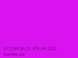 XYZ 44.56,21.476,84.235 Color is a normal magenta color and the nearest color is Phlox #df00ff. Hex code #d912f0 and RGB value is rgb(217,18,240). In RGB color space, this color is composed of 85% red, 7% green, 94% blue, In CMYK color space, this color is composed of 10% cyan, 93% magenta, 0% yellow , 6% black , In HSL color space, this color has a hue angle of 294° , 88% saturation and 51% lightness.