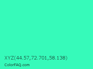 XYZ 44.57,72.701,58.138 Color is a normal green color and the nearest color is Turquoise #40e0d0. Hex code #36faba and RGB value is rgb(54,250,186). In RGB color space, this color is composed of 21% red, 98% green, 73% blue, In CMYK color space, this color is composed of 78% cyan, 0% magenta, 26% yellow , 2% black , In HSL color space, this color has a hue angle of 160° , 95% saturation and 60% lightness.