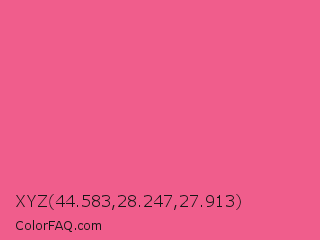 XYZ 44.583,28.247,27.913 Color is a light rose color and the nearest color is Strawberry #fc5a8d. Hex code #f05d8c and RGB value is rgb(240,93,140). In RGB color space, this color is composed of 94% red, 36% green, 55% blue, In CMYK color space, this color is composed of 0% cyan, 61% magenta, 42% yellow , 6% black , In HSL color space, this color has a hue angle of 341° , 83% saturation and 65% lightness.