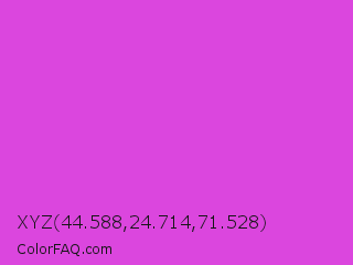 XYZ 44.588,24.714,71.528 Color is a normal magenta color and the nearest color is Steel Pink #cc33cc. Hex code #db46de and RGB value is rgb(219,70,222). In RGB color space, this color is composed of 86% red, 27% green, 87% blue, In CMYK color space, this color is composed of 1% cyan, 68% magenta, 0% yellow , 13% black , In HSL color space, this color has a hue angle of 299° , 70% saturation and 57% lightness.