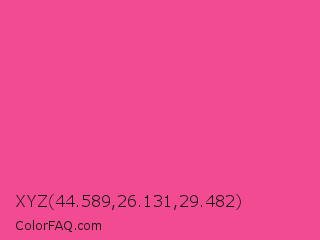 XYZ 44.589,26.131,29.482 Color is a light rose color and the nearest color is French Rose #f64a8a. Hex code #f34b91 and RGB value is rgb(243,75,145). In RGB color space, this color is composed of 95% red, 29% green, 57% blue, In CMYK color space, this color is composed of 0% cyan, 69% magenta, 40% yellow , 5% black , In HSL color space, this color has a hue angle of 335° , 88% saturation and 62% lightness.