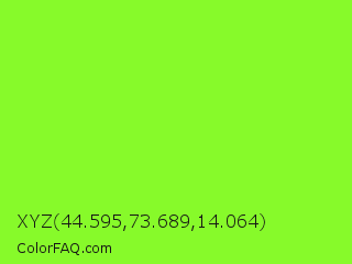 XYZ 44.595,73.689,14.064 Color is a normal green color and the nearest color is Spring Frost #87ff2a. Hex code #87fa2a and RGB value is rgb(135,250,42). In RGB color space, this color is composed of 53% red, 98% green, 16% blue, In CMYK color space, this color is composed of 46% cyan, 0% magenta, 83% yellow , 2% black , In HSL color space, this color has a hue angle of 93° , 95% saturation and 57% lightness.