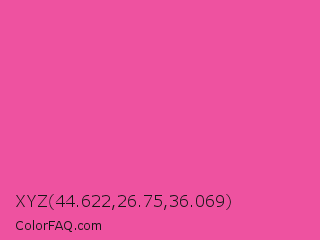 XYZ 44.622,26.75,36.069 Color is a light rose color and the nearest color is Brilliant Rose #f653a6. Hex code #ee52a0 and RGB value is rgb(238,82,160). In RGB color space, this color is composed of 93% red, 32% green, 63% blue, In CMYK color space, this color is composed of 0% cyan, 66% magenta, 33% yellow , 7% black , In HSL color space, this color has a hue angle of 330° , 82% saturation and 63% lightness.