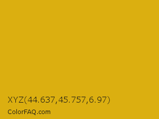 XYZ 44.637,45.757,6.97 Color is a normal yellow color and the nearest color is Galliano #dcb20c. Hex code #dbaf10 and RGB value is rgb(219,175,16). In RGB color space, this color is composed of 86% red, 69% green, 6% blue, In CMYK color space, this color is composed of 0% cyan, 20% magenta, 93% yellow , 14% black , In HSL color space, this color has a hue angle of 47° , 86% saturation and 46% lightness.
