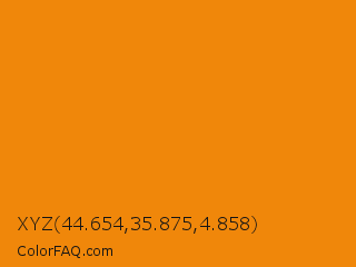 XYZ 44.654,35.875,4.858 Color is a normal orange color and the nearest color is Tangerine #f28500. Hex code #f0870a and RGB value is rgb(240,135,10). In RGB color space, this color is composed of 94% red, 53% green, 4% blue, In CMYK color space, this color is composed of 0% cyan, 44% magenta, 96% yellow , 6% black , In HSL color space, this color has a hue angle of 33° , 92% saturation and 49% lightness.