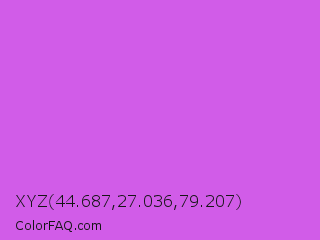 XYZ 44.687,27.036,79.207 Color is a light purple color and the nearest color is Orchid #da70d6. Hex code #d15ce8 and RGB value is rgb(209,92,232). In RGB color space, this color is composed of 82% red, 36% green, 91% blue, In CMYK color space, this color is composed of 10% cyan, 60% magenta, 0% yellow , 9% black , In HSL color space, this color has a hue angle of 290° , 75% saturation and 64% lightness.