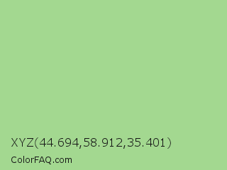 XYZ 44.694,58.912,35.401 Color is a light green color and the nearest color is Feijoa #9fdd8c. Hex code #a3d890 and RGB value is rgb(163,216,144). In RGB color space, this color is composed of 64% red, 85% green, 56% blue, In CMYK color space, this color is composed of 25% cyan, 0% magenta, 33% yellow , 15% black , In HSL color space, this color has a hue angle of 104° , 48% saturation and 71% lightness.