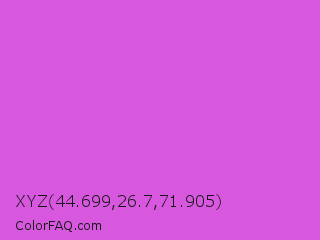 XYZ 44.699,26.7,71.905 Color is a light magenta color and the nearest color is Orchid #da70d6. Hex code #d758de and RGB value is rgb(215,88,222). In RGB color space, this color is composed of 84% red, 35% green, 87% blue, In CMYK color space, this color is composed of 3% cyan, 60% magenta, 0% yellow , 13% black , In HSL color space, this color has a hue angle of 297° , 67% saturation and 61% lightness.