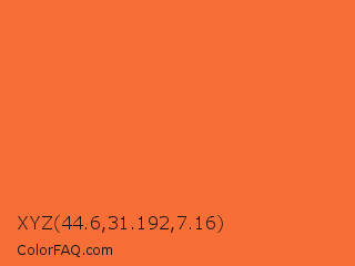 XYZ 44.6,31.192,7.16 Color is a normal orange color and the nearest color is Burning Orange #ff7034. Hex code #f76e36 and RGB value is rgb(247,110,54). In RGB color space, this color is composed of 97% red, 43% green, 21% blue, In CMYK color space, this color is composed of 0% cyan, 55% magenta, 78% yellow , 3% black , In HSL color space, this color has a hue angle of 17° , 92% saturation and 59% lightness.