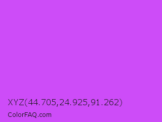 XYZ 44.705,24.925,91.262 Color is a light purple color and the nearest color is Medium Orchid #ba55d3. Hex code #cd4cf8 and RGB value is rgb(205,76,248). In RGB color space, this color is composed of 80% red, 30% green, 97% blue, In CMYK color space, this color is composed of 17% cyan, 69% magenta, 0% yellow , 3% black , In HSL color space, this color has a hue angle of 285° , 92% saturation and 64% lightness.