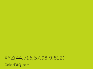 XYZ 44.716,57.98,9.812 Color is a normal yellow color and the nearest color is Key Lime Pie #bfc921. Hex code #bdd41a and RGB value is rgb(189,212,26). In RGB color space, this color is composed of 74% red, 83% green, 10% blue, In CMYK color space, this color is composed of 11% cyan, 0% magenta, 88% yellow , 17% black , In HSL color space, this color has a hue angle of 67° , 78% saturation and 47% lightness.