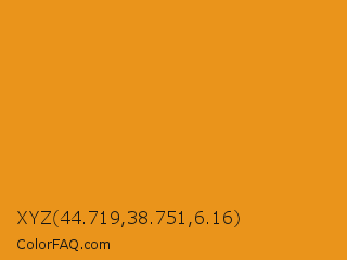 XYZ 44.719,38.751,6.16 Color is a normal orange color and the nearest color is Carrot Orange #ed9121. Hex code #ea941b and RGB value is rgb(234,148,27). In RGB color space, this color is composed of 92% red, 58% green, 11% blue, In CMYK color space, this color is composed of 0% cyan, 37% magenta, 88% yellow , 8% black , In HSL color space, this color has a hue angle of 35° , 83% saturation and 51% lightness.