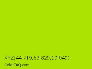 XYZ 44.719,63.829,10.049 Color is a normal lime color and the nearest color is Vivid Lime Green #a6d608. Hex code #ade303 and RGB value is rgb(173,227,3). In RGB color space, this color is composed of 68% red, 89% green, 1% blue, In CMYK color space, this color is composed of 24% cyan, 0% magenta, 99% yellow , 11% black , In HSL color space, this color has a hue angle of 74° , 97% saturation and 45% lightness.