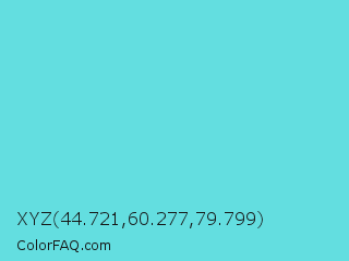 XYZ 44.721,60.277,79.799 Color is a light cyan color and the nearest color is Turquoise Blue #6cdae7. Hex code #63dee0 and RGB value is rgb(99,222,224). In RGB color space, this color is composed of 39% red, 87% green, 88% blue, In CMYK color space, this color is composed of 56% cyan, 1% magenta, 0% yellow , 12% black , In HSL color space, this color has a hue angle of 181° , 67% saturation and 63% lightness.