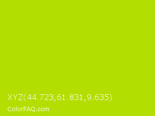 XYZ 44.723,61.831,9.635 Color is a normal lime color and the nearest color is Fuego #bede0d. Hex code #b3de02 and RGB value is rgb(179,222,2). In RGB color space, this color is composed of 70% red, 87% green, 1% blue, In CMYK color space, this color is composed of 19% cyan, 0% magenta, 99% yellow , 13% black , In HSL color space, this color has a hue angle of 72° , 98% saturation and 44% lightness.