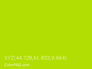XYZ 44.728,61.833,9.664 Color is a normal lime color and the nearest color is Fuego #bede0d. Hex code #b3de03 and RGB value is rgb(179,222,3). In RGB color space, this color is composed of 70% red, 87% green, 1% blue, In CMYK color space, this color is composed of 19% cyan, 0% magenta, 99% yellow , 13% black , In HSL color space, this color has a hue angle of 72° , 97% saturation and 44% lightness.