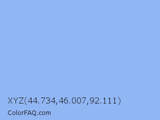 XYZ 44.734,46.007,92.111 Color is a light blue color and the nearest color is Jordy Blue #8ab9f1. Hex code #91b6f4 and RGB value is rgb(145,182,244). In RGB color space, this color is composed of 57% red, 71% green, 96% blue, In CMYK color space, this color is composed of 41% cyan, 25% magenta, 0% yellow , 4% black , In HSL color space, this color has a hue angle of 218° , 82% saturation and 76% lightness.