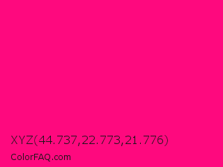 XYZ 44.737,22.773,21.776 Color is a normal rose color and the nearest color is Rose #ff007f. Hex code #fe097e and RGB value is rgb(254,9,126). In RGB color space, this color is composed of 100% red, 4% green, 49% blue, In CMYK color space, this color is composed of 0% cyan, 96% magenta, 50% yellow , 0% black , In HSL color space, this color has a hue angle of 331° , 99% saturation and 52% lightness.