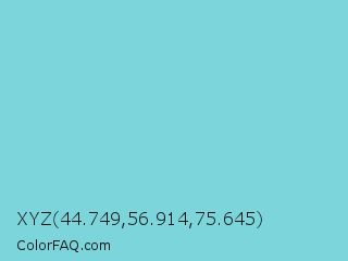 XYZ 44.749,56.914,75.645 Color is a light cyan color and the nearest color is Middle Blue #7ed4e6. Hex code #7bd5db and RGB value is rgb(123,213,219). In RGB color space, this color is composed of 48% red, 84% green, 86% blue, In CMYK color space, this color is composed of 44% cyan, 3% magenta, 0% yellow , 14% black , In HSL color space, this color has a hue angle of 184° , 57% saturation and 67% lightness.