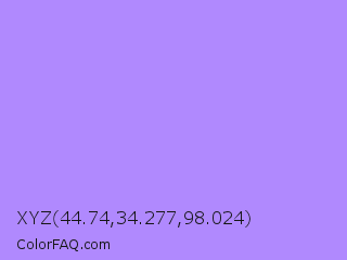 XYZ 44.74,34.277,98.024 Color is a light indigo color and the nearest color is Dull Lavender #a899e6. Hex code #b089fe and RGB value is rgb(176,137,254). In RGB color space, this color is composed of 69% red, 54% green, 100% blue, In CMYK color space, this color is composed of 31% cyan, 46% magenta, 0% yellow , 0% black , In HSL color space, this color has a hue angle of 260° , 98% saturation and 77% lightness.