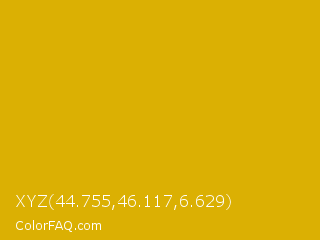 XYZ 44.755,46.117,6.629 Color is a normal yellow color and the nearest color is Galliano #dcb20c. Hex code #dbb003 and RGB value is rgb(219,176,3). In RGB color space, this color is composed of 86% red, 69% green, 1% blue, In CMYK color space, this color is composed of 0% cyan, 20% magenta, 99% yellow , 14% black , In HSL color space, this color has a hue angle of 48° , 97% saturation and 44% lightness.