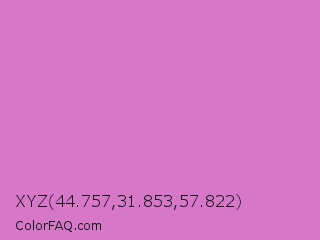XYZ 44.757,31.853,57.822 Color is a light magenta color and the nearest color is French Mauve #d473d4. Hex code #d678c7 and RGB value is rgb(214,120,199). In RGB color space, this color is composed of 84% red, 47% green, 78% blue, In CMYK color space, this color is composed of 0% cyan, 44% magenta, 7% yellow , 16% black , In HSL color space, this color has a hue angle of 310° , 53% saturation and 65% lightness.