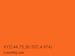 XYZ 44.75,30.537,4.974 Color is a normal orange color and the nearest color is Orange #ff681f. Hex code #fa6921 and RGB value is rgb(250,105,33). In RGB color space, this color is composed of 98% red, 41% green, 13% blue, In CMYK color space, this color is composed of 0% cyan, 58% magenta, 87% yellow , 2% black , In HSL color space, this color has a hue angle of 20° , 96% saturation and 55% lightness.
