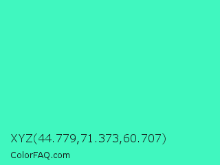 XYZ 44.779,71.373,60.707 Color is a light green color and the nearest color is Turquoise #40e0d0. Hex code #40f7bf and RGB value is rgb(64,247,191). In RGB color space, this color is composed of 25% red, 97% green, 75% blue, In CMYK color space, this color is composed of 74% cyan, 0% magenta, 23% yellow , 3% black , In HSL color space, this color has a hue angle of 162° , 92% saturation and 61% lightness.