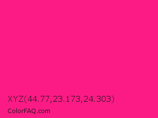 XYZ 44.77,23.173,24.303 Color is a normal rose color and the nearest color is Fluorescent Pink #ff1493. Hex code #fc1b85 and RGB value is rgb(252,27,133). In RGB color space, this color is composed of 99% red, 11% green, 52% blue, In CMYK color space, this color is composed of 0% cyan, 89% magenta, 47% yellow , 1% black , In HSL color space, this color has a hue angle of 332° , 97% saturation and 55% lightness.