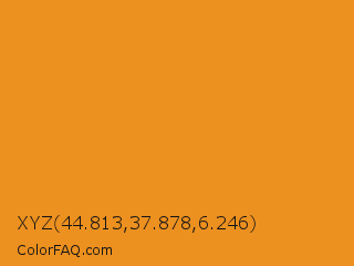 XYZ 44.813,37.878,6.246 Color is a normal orange color and the nearest color is Carrot Orange #ed9121. Hex code #ec901f and RGB value is rgb(236,144,31). In RGB color space, this color is composed of 93% red, 56% green, 12% blue, In CMYK color space, this color is composed of 0% cyan, 39% magenta, 87% yellow , 7% black , In HSL color space, this color has a hue angle of 33° , 84% saturation and 52% lightness.