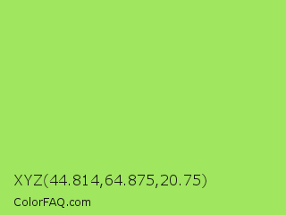 XYZ 44.814,64.875,20.75 Color is a light green color and the nearest color is Inchworm #b2ec5d. Hex code #a0e65e and RGB value is rgb(160,230,94). In RGB color space, this color is composed of 63% red, 90% green, 37% blue, In CMYK color space, this color is composed of 30% cyan, 0% magenta, 59% yellow , 10% black , In HSL color space, this color has a hue angle of 91° , 73% saturation and 64% lightness.