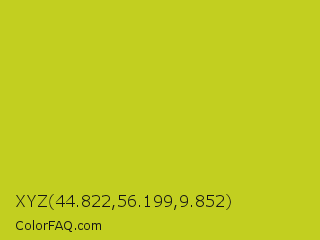 XYZ 44.822,56.199,9.852 Color is a normal yellow color and the nearest color is Key Lime Pie #bfc921. Hex code #c2cf20 and RGB value is rgb(194,207,32). In RGB color space, this color is composed of 76% red, 81% green, 13% blue, In CMYK color space, this color is composed of 6% cyan, 0% magenta, 85% yellow , 19% black , In HSL color space, this color has a hue angle of 64° , 73% saturation and 47% lightness.