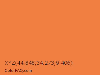 XYZ 44.848,34.273,9.406 Color is a normal orange color and the nearest color is Jaffa #ef863f. Hex code #f17f42 and RGB value is rgb(241,127,66). In RGB color space, this color is composed of 95% red, 50% green, 26% blue, In CMYK color space, this color is composed of 0% cyan, 47% magenta, 73% yellow , 5% black , In HSL color space, this color has a hue angle of 21° , 86% saturation and 60% lightness.