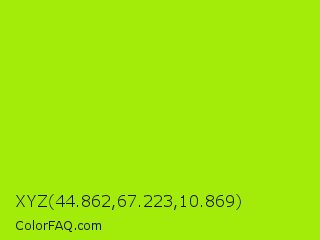 XYZ 44.862,67.223,10.869 Color is a normal lime color and the nearest color is Inch Worm #b0e313. Hex code #a3eb09 and RGB value is rgb(163,235,9). In RGB color space, this color is composed of 64% red, 92% green, 4% blue, In CMYK color space, this color is composed of 31% cyan, 0% magenta, 96% yellow , 8% black , In HSL color space, this color has a hue angle of 79° , 93% saturation and 48% lightness.