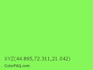 XYZ 44.895,72.311,21.042 Color is a light green color and the nearest color is Kiwi #8ee53f. Hex code #86f759 and RGB value is rgb(134,247,89). In RGB color space, this color is composed of 53% red, 97% green, 35% blue, In CMYK color space, this color is composed of 46% cyan, 0% magenta, 64% yellow , 3% black , In HSL color space, this color has a hue angle of 103° , 91% saturation and 66% lightness.