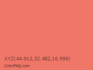 XYZ 44.912,32.482,16.999 Color is a light red color and the nearest color is Coral Reef Hipster Salmon #fd7c6e. Hex code #f07668 and RGB value is rgb(240,118,104). In RGB color space, this color is composed of 94% red, 46% green, 41% blue, In CMYK color space, this color is composed of 0% cyan, 51% magenta, 57% yellow , 6% black , In HSL color space, this color has a hue angle of 6° , 82% saturation and 67% lightness.