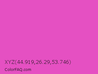 XYZ 44.919,26.29,53.746 Color is a light magenta color and the nearest color is Light Deep Pink #ff5ccd. Hex code #e550c2 and RGB value is rgb(229,80,194). In RGB color space, this color is composed of 90% red, 31% green, 76% blue, In CMYK color space, this color is composed of 0% cyan, 65% magenta, 15% yellow , 10% black , In HSL color space, this color has a hue angle of 314° , 74% saturation and 61% lightness.